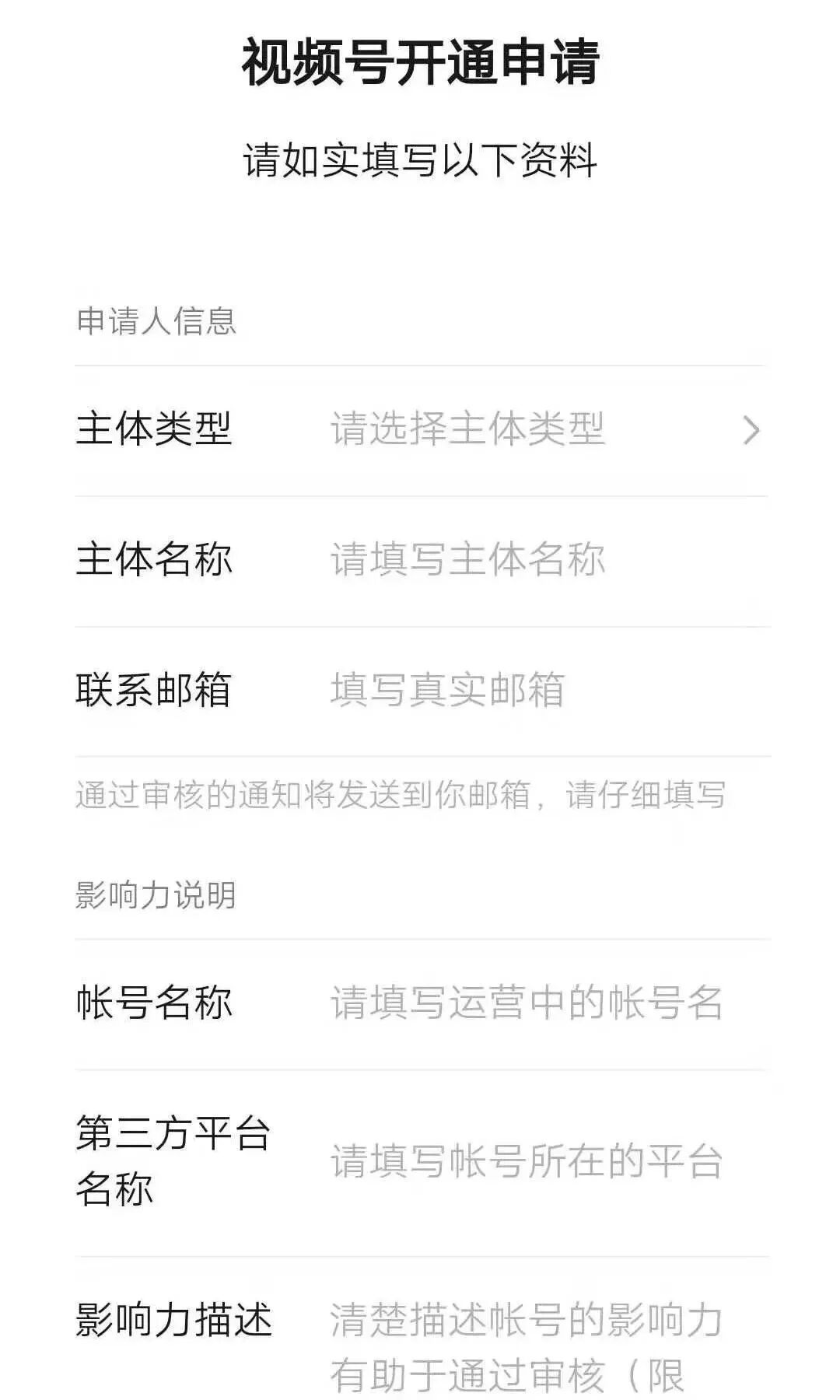 当你有了视频号申请入口的时候,就可以填写信息进行申请了(如下图)。