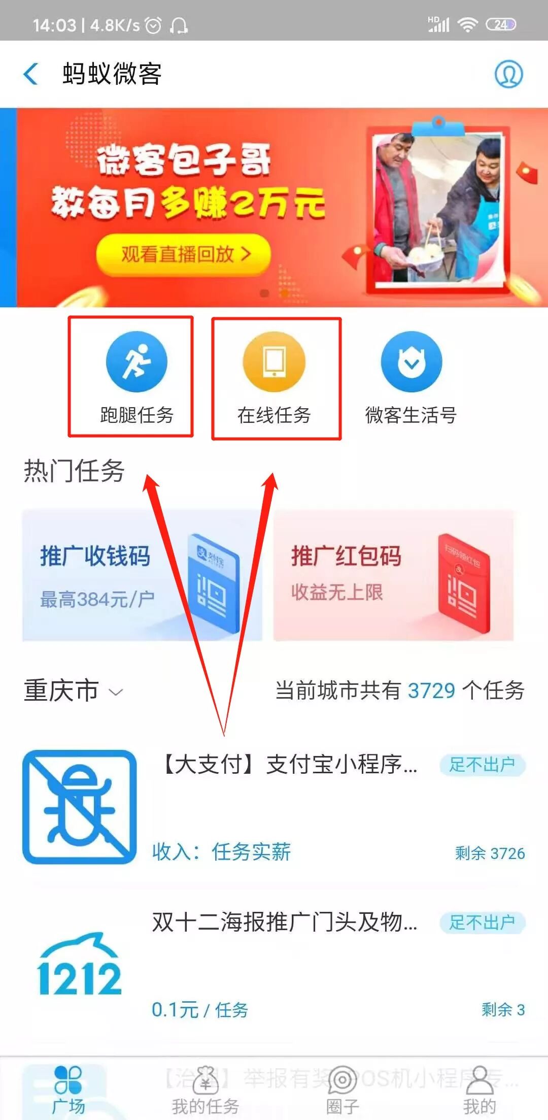 如果你满足了上述两个条件,然后点击芝麻微客进去就能看到下图这个界面,蚂蚁微客的任务分为两大类“跑腿接单”和“线上任务”。