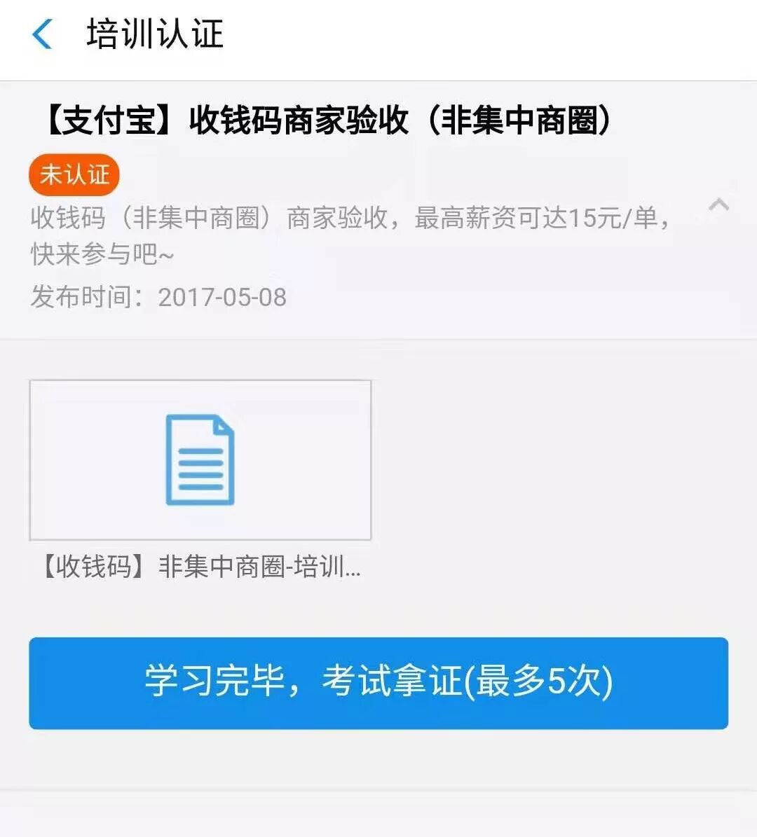 据我所知,每个某付宝用户只有五次机会通过考试,所以在考试前务必做些准备,一定要仔细阅读培训手册,大部分的考试题目都来源于此,只要你认真学习了手册,考试对你来说就简单了。