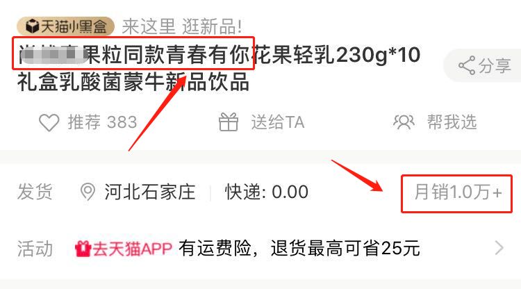 卖产品蹭热点更不用多说了,我们经常在某宝上看到“某某同款”的字样,而且不得不说这样卖产品确实销量好很多。通过下面的截图我们就能看出来,就某个明星同款饮料,月销量都有一万多。