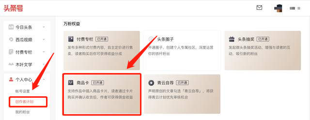 加入创作者计划的作者,就可以自助申请商品卡功能,开通后就能享有图文、视频、微头条、直播、问答、小视频在内的各种权限。
